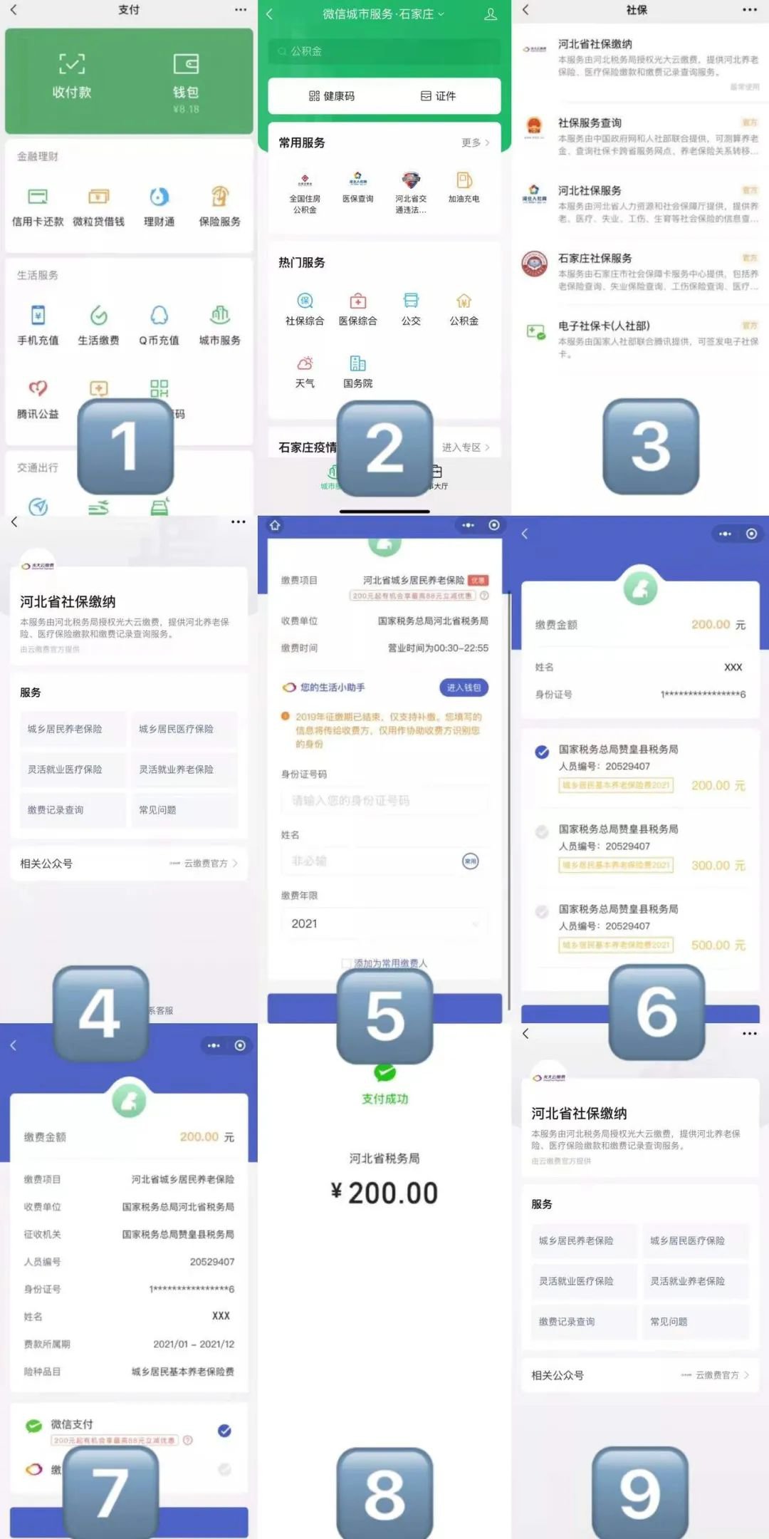 进入微信,依次按照如下路径操作:我 →支付→城市服务。在上方选择对应城市,选择“社保综合”。选择:河北省社保缴纳。选择服务:城乡居民养老保险。录入缴费人身份证号码(身份证号含字母需大写)、姓名、选择缴费年份。选择缴费档次,按提示完成操作。核对全部信息,确认缴费。使用微信、任意银行卡完成付款。缴费查询,缴费成功后,通过“缴费记录查询”模块,可查询缴费记录。