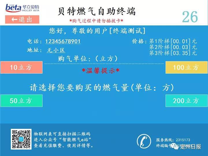 目前,自助终端缴费仅支持贝特卡IC卡用户,缴费时需选择“IC卡燃气表”,然后通过读用户卡,获取天然气用户基础资料,确认无误后选择需要购气的燃气方数,并选择微信支付,即可完成缴费。