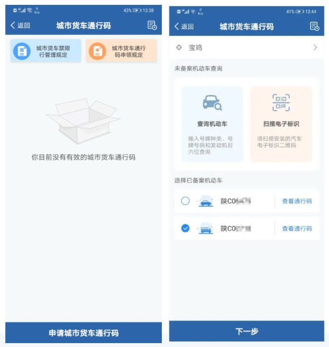 用户点击【城市货车通行码申领】,进入通行码首页面。点击“申请城市货车通行码”按钮进入申请流程。