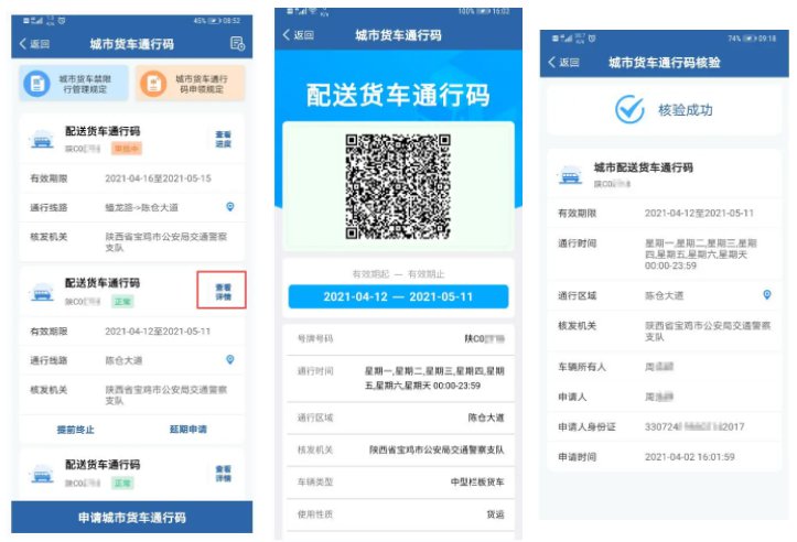 审核通过的,用户点击“交管12123”APP【城市货车通行码申领】进入城市货车通行码首页,点击查看详情,可以查看已核发的货车电子通行码允许车辆通行的时段、路段或区域等具体信息,请驾驶人根据要求驾车通行。在路面遇到民警检查时,可以出示电子通行码供民警扫码核验。