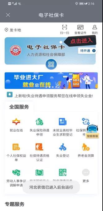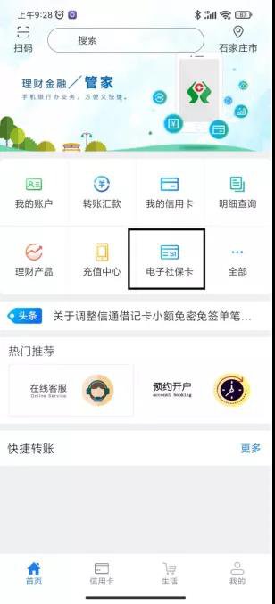 1.登录河北农信手机银行客户端,首页选择“电子社保卡”;