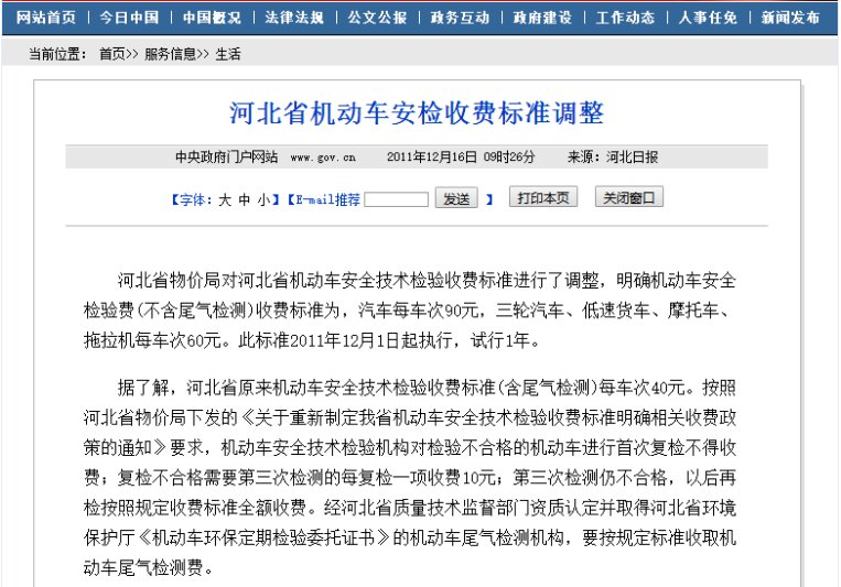 河北省物价局对河北省机动车安全技术检验收费标准进行了调整,明确机动车安全检验费(不含尾气检测)收费标准为,汽车每车次90元,三轮汽车、低速货车、摩托车、拖拉机每车次60元。此标准2011年12月1日起执行,试行1年。