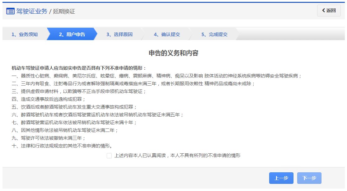 步骤1:【业务须知】在该步骤,用户需认真阅读其内容,包括:办理延期换证需要注意的各项内容和相关责任,如下图所示。同意的,勾选“阅读并同意”,点击【下一步】进入步骤2【用户申告】。