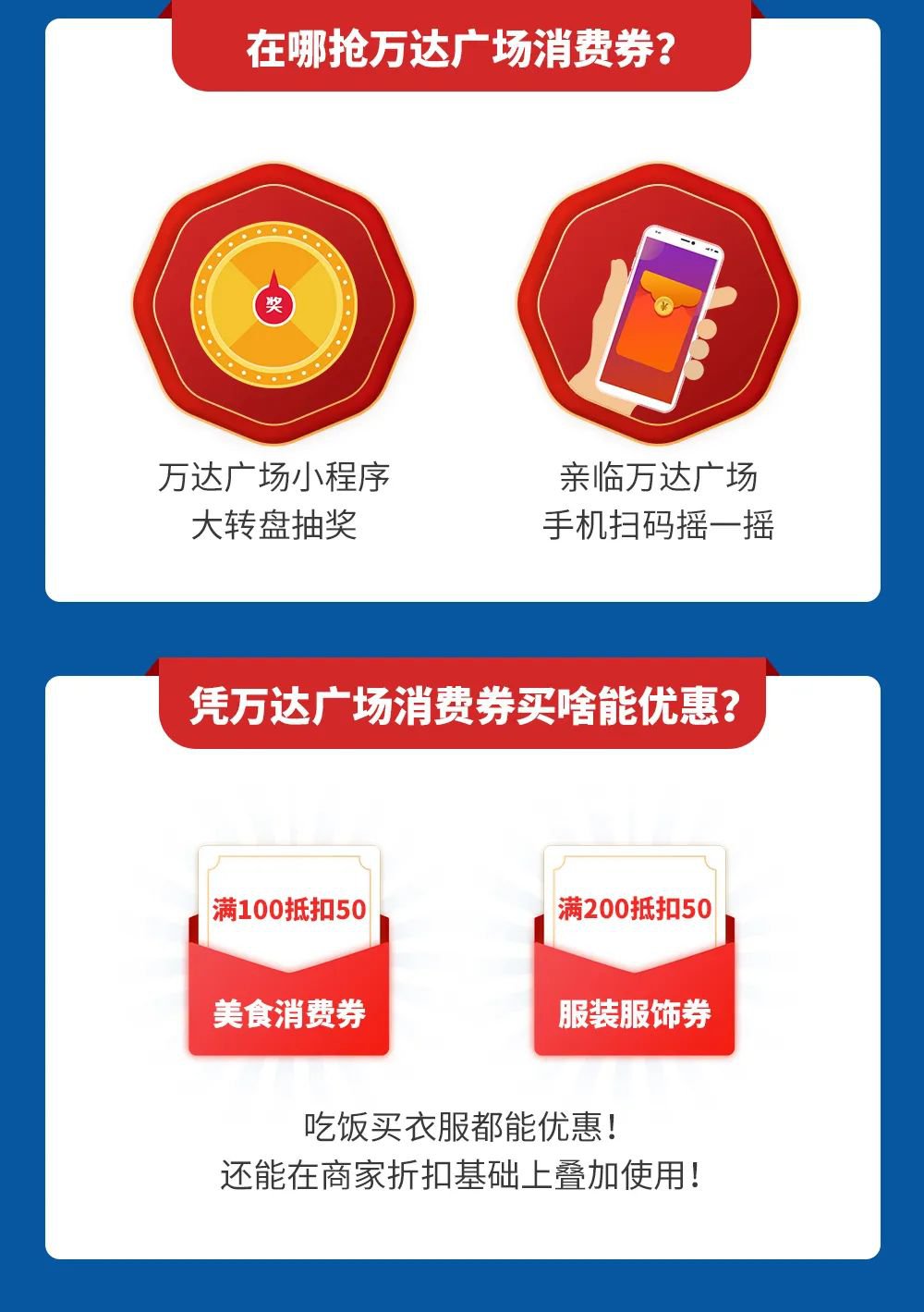 发放详情:全国320座万达广场(除北京CBD、青岛台东、长春重庆路、南昌八一和丹寨小镇外),每座万达广场每天发放400张电子消费券,面额50元。